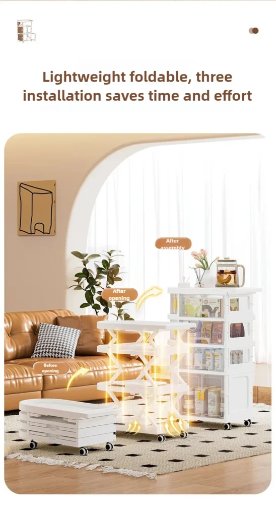 Equipped with four sturdy wheels that glide smoothly across any surface, these shelves move a full 360 degrees, allowing for smooth transitions from one space to another.